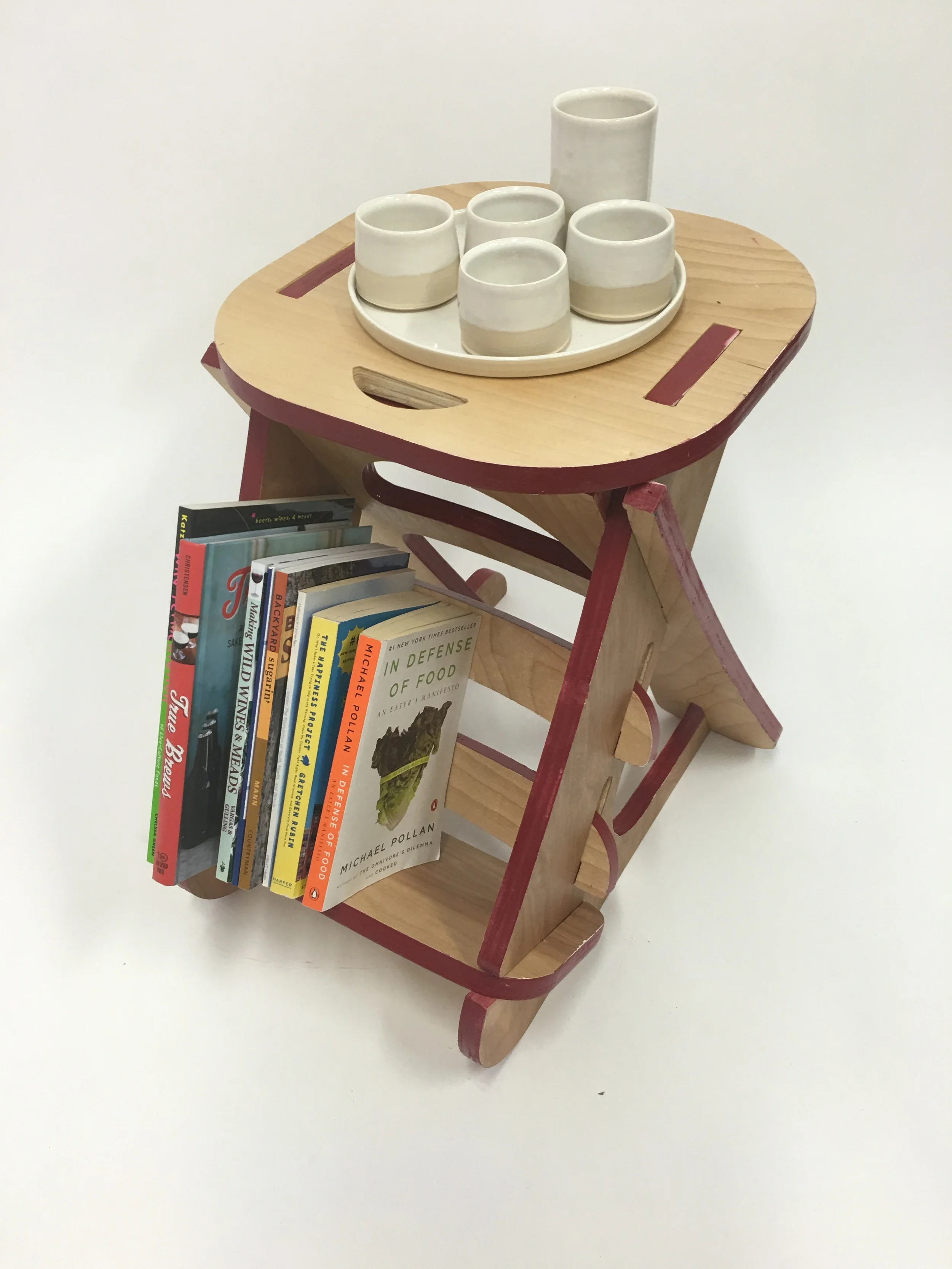 This project focused on fast idea generation, prototyping, modeling, 3D rendering and the use of the lasercutter, CNC router and Adobe Create Suite to design a lie-flat plywood design for a stool. This stool doubles as a small bookshelf and board game set.